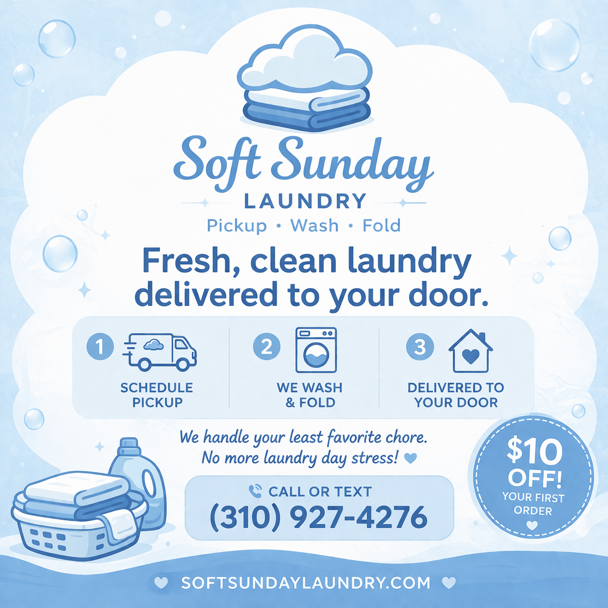 Soft Sunday Laundry offers convenient laundry pickup and delivery in Los Angeles, making it easier than ever to enjoy fresh, clean clothes without the hassle. Our professional wash and fold service includes contactless pickup, next-day turnaround, and careful handling of every order. Whether you’re a busy professional, a family, or simply want to save time, we take laundry off your to-do list. Book your pickup today and get $10 off your first order — clean laundry has never felt this effortless. ☁️